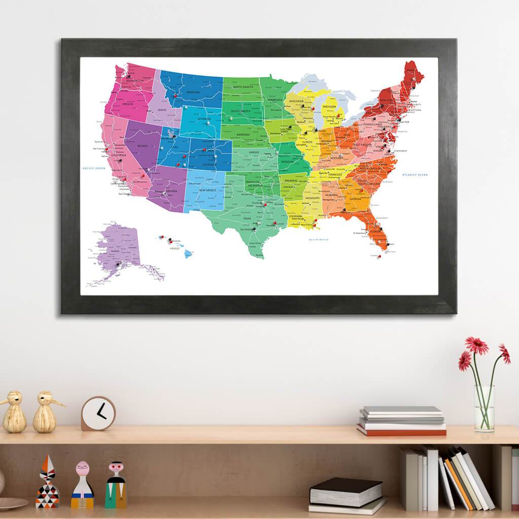 Colorful United States Map | Framed USA Map with Pins Push Pin